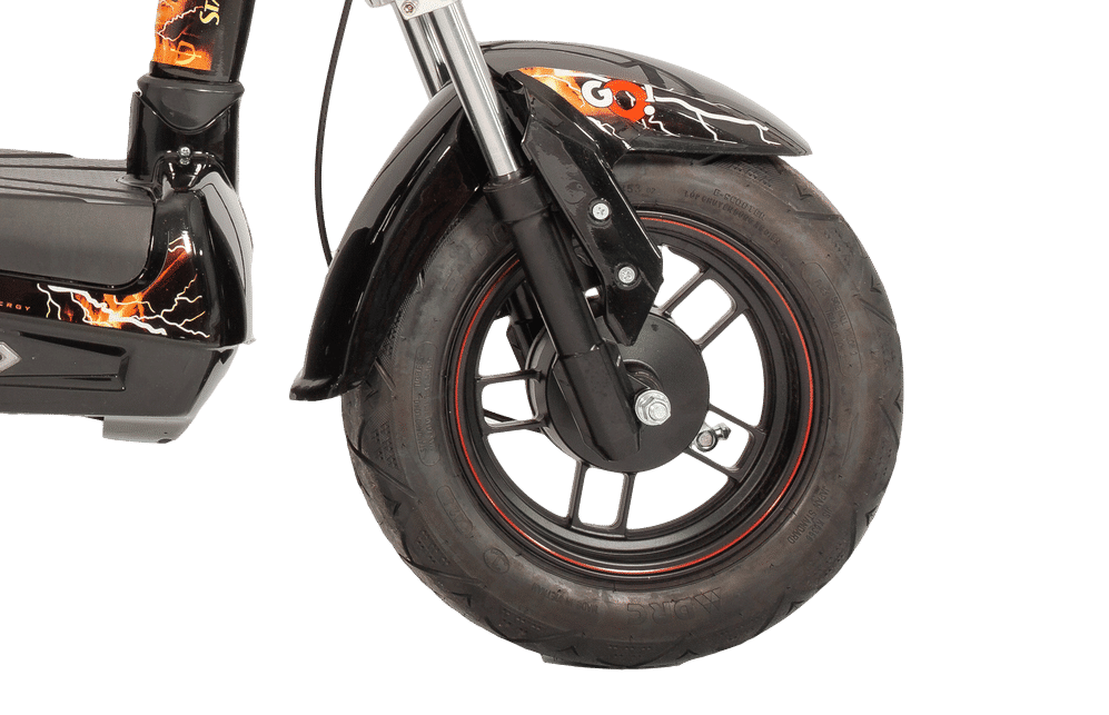 Có bánh trước với lốp cao su không ruột 12inch, bao quanh vành đúc hợp kim kiểu dang thể thao, giảm sóc dầu êm ái và thắng cơ an toàn giúp người điều khiển làm chủ tốc độ của chiếc xe.